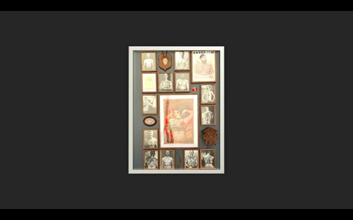 Pre-loved: framed tattoos imagery, Electric Chapel poster, Captain Constentenus poster, ‘the electric kiss’ paperback, cuckoo clock, half pool ball, skull mount